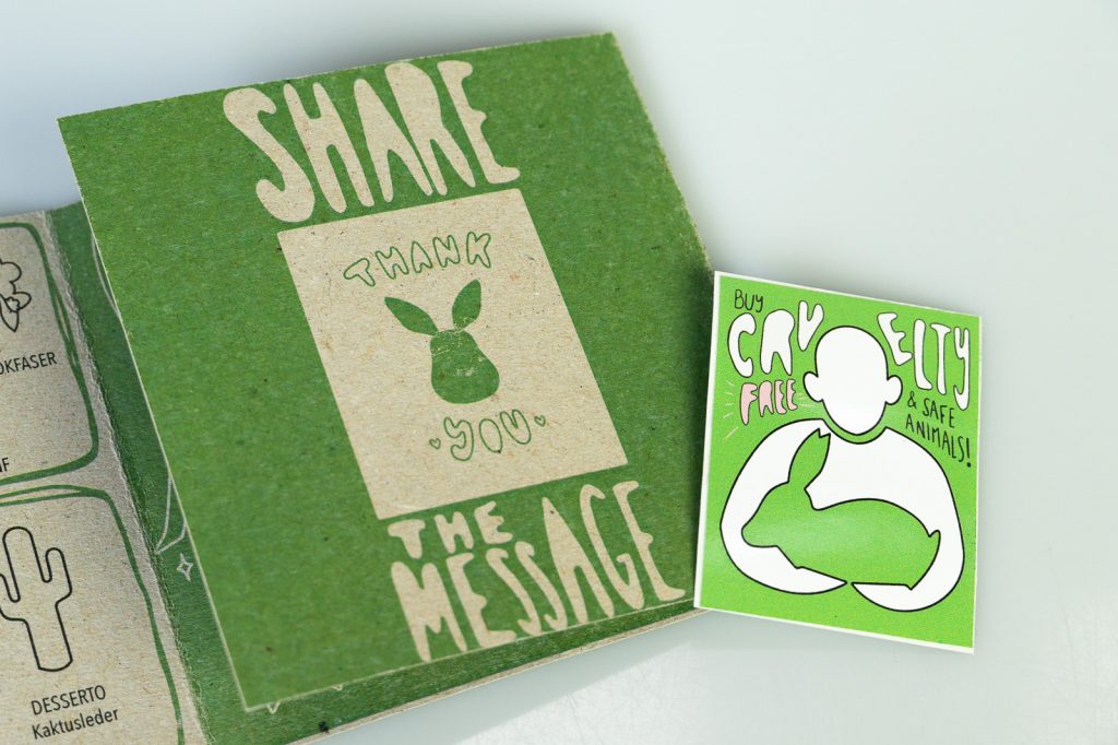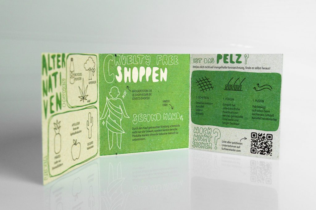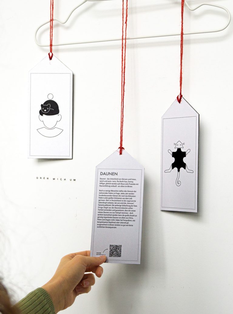 Täglich werden tausende Tiere für die Modeindustrie gequält und getötet. Den meisten Menschen ist das Ausmaß des Tierleids für ihre Kleidung nicht wirklich bewusst. Das Projekt soll das Verantwortungsbewusstsein von Konsument*innen ansprechen und über verschiedene tierische Materialien informieren. Piktogramme und Infotexte auf Kleidungsetiketten decken die wahren Ursprünge der Materialien auf. Um auch Alternativen aufzuzeigen und Interessierten weitere Informationen an die Hand zu geben liegt ein Leporello dem Projekt bei. Mit einem herausnehmbaren Sticker können Konsument*innen ein Statement setzen und sich gegen Tierleid positionieren.
