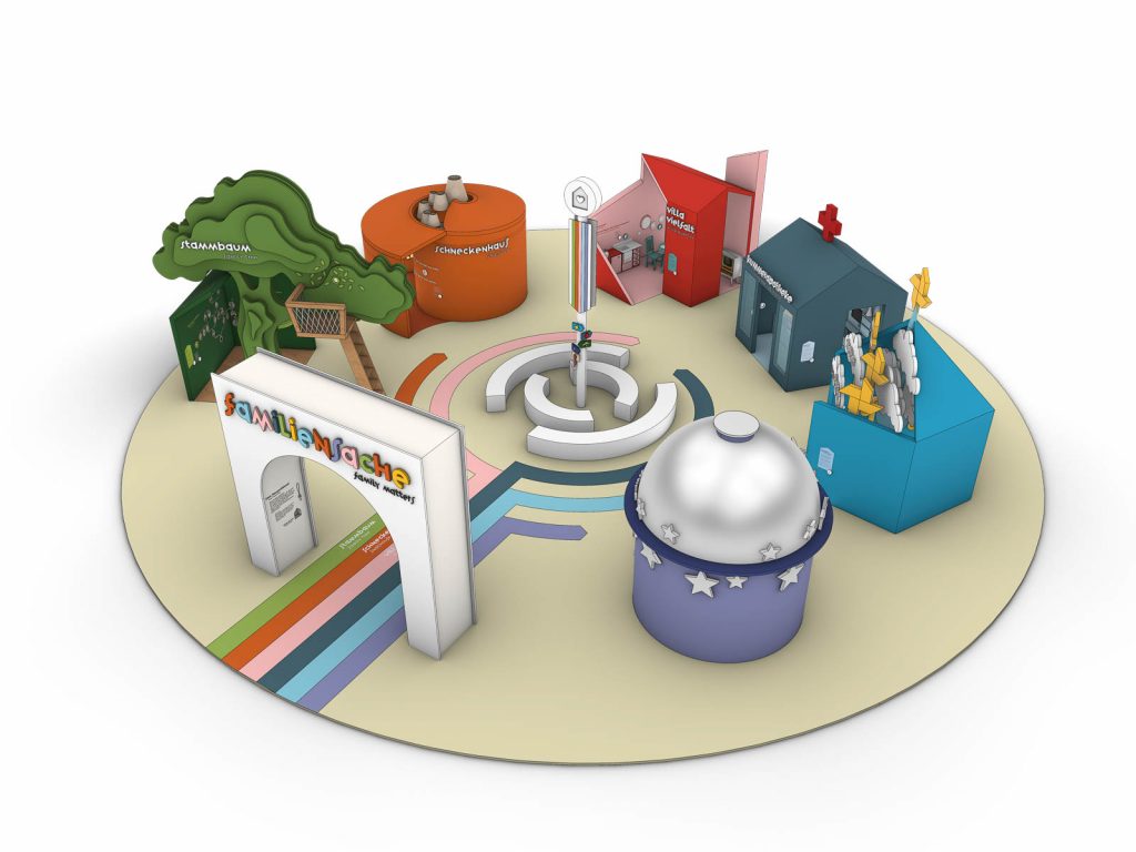 Familiensache ist ein Ausstellungskonzept, das Kinder im Grundschulalter genau an diesem Punkt abholt. Die Kinder betreten ein fantasievolles Dorf, dass zum selbst erkunden und auseinandersetzen einlädt. Ganz frei, spielerisch und partizipativ. Dabei entscheidet jedes Kind selbst, womit es sich beschäftigen möchte. Die Ausstellungsgestaltung ist in Größe, Vermittlung und Ästhetik genau für Kinder gemacht.