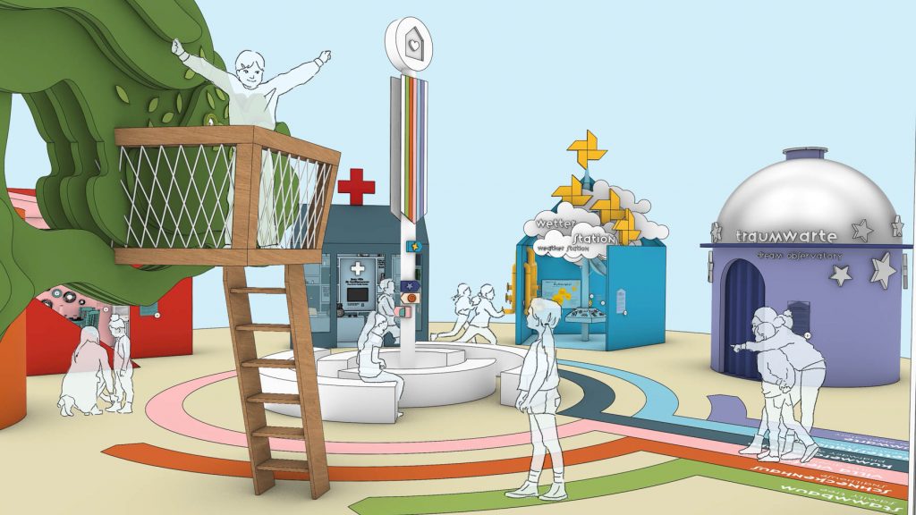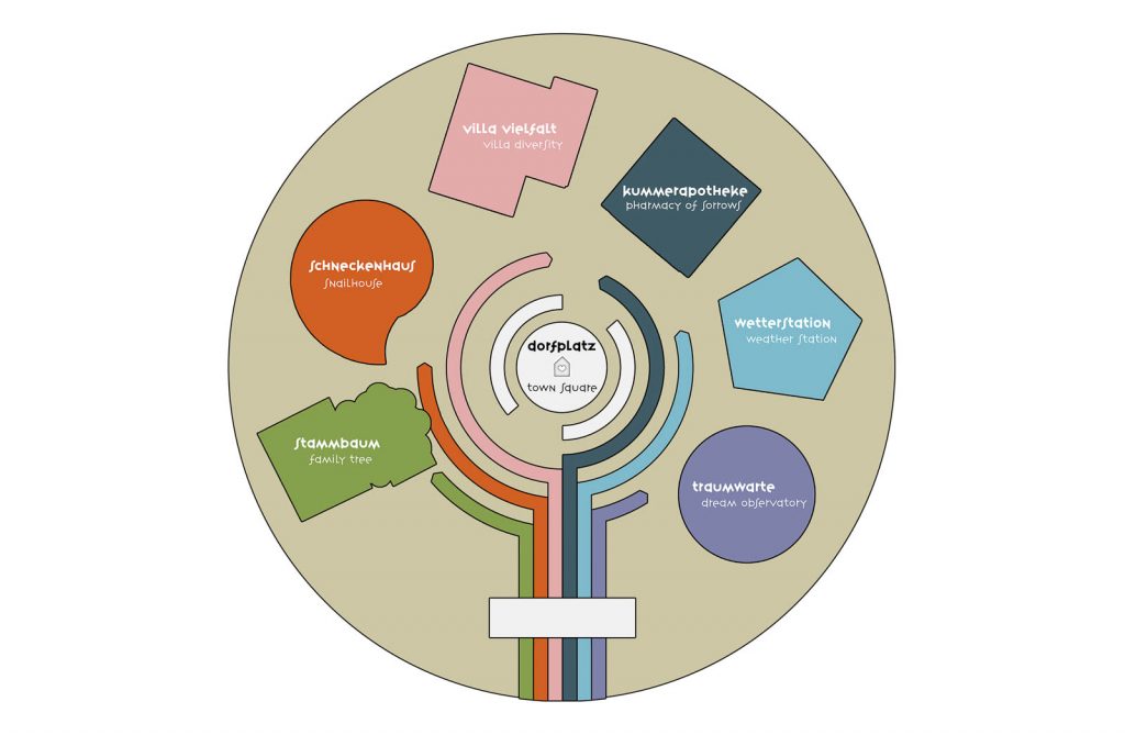 Durch ein Eingangstor betreten die kleinen und großen Besucher*innen das Dorf. Hier werden sie in das Thema eingeführt und bekommen ein Token, einen eigenen Haustürschlüssel, der sie durch die Ausstellung als interaktives Tool begleiten wird. Sechs verschiedene Häuschen eröffnen unterschiedliche visuelle und thematische Welten. Der Dorfplatz in der Mitte lädt zum Ausruhen und Austauschen ein.